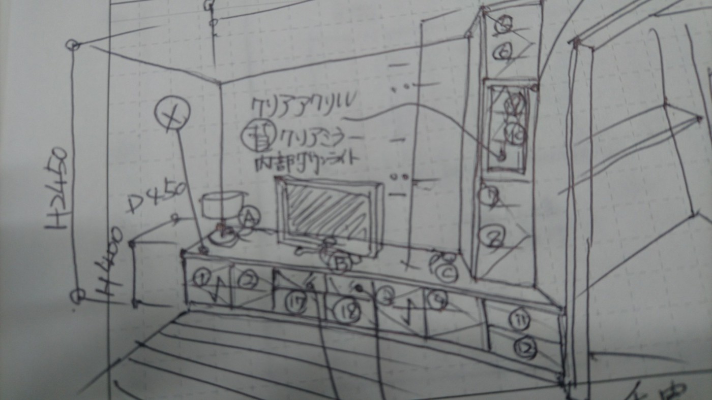 これはオーダー家具(造作家具)のご相談時のものです。お客様のご要望をわかりやすくイメージできるよう絵を書いています。もちろん絵心ないわたしが書いたのではありません。