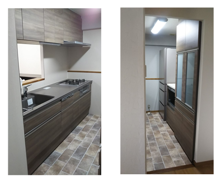 築30年使い続けたキッチンを取り替え、壁紙と床も一新しました。キッチンと同じ面材の家電収納とカップボードを設置し、統一感のあるキッチンに仕上げました。