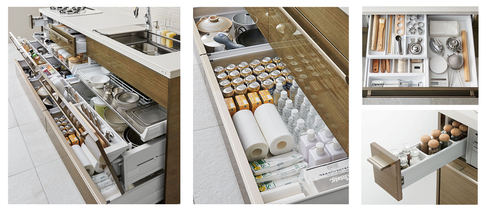 調理する人の動線に沿って道具が取り出せるよう、考えられた収納です。扉が斜めに傾く動きを利用して、引き出しを開けるために必要な力を軽減。