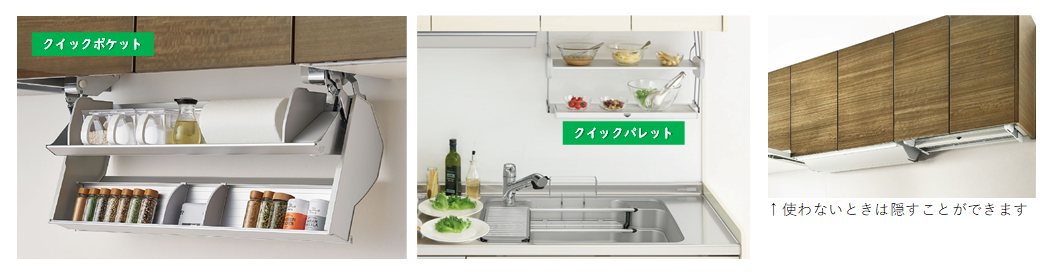 自然に手が届く目の前が、便利な収納と仮置きスペースに。だからワークトップをゆったり使える。使わないときは隠せるので、キッチンをすっきりと見せることが可能です。ポケットには調味料などの小物を入れることができ、目の高さにあるので取り出しやすく、調理をスムーズにしてくれます。