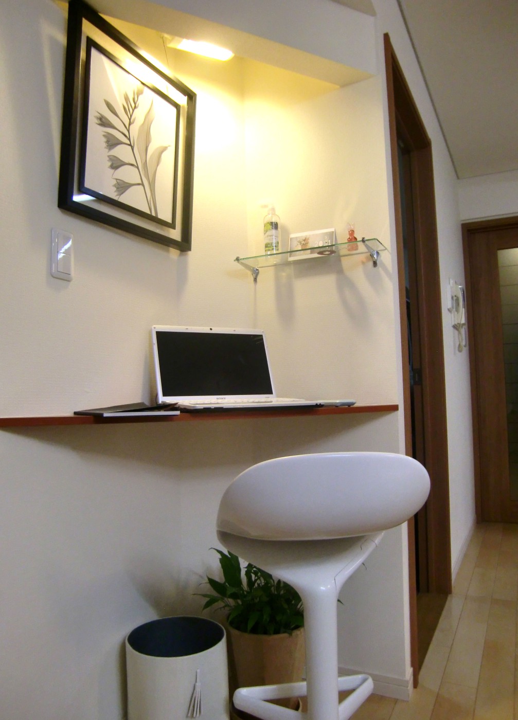 クローゼットを設けた余りのスペースに、造り付けの机と棚板を設置することで