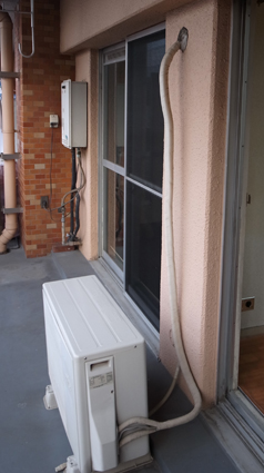 エアコンは、お部屋の壁などに設置されている室内機(冷暖房が出る機械=エアコン本体)と、ベランダや玄関横の共用廊下に設置されている室外機(冷暖房を作る機械)が冷媒管とドレーン管と呼ばれる配管で結ばれて構成されています。