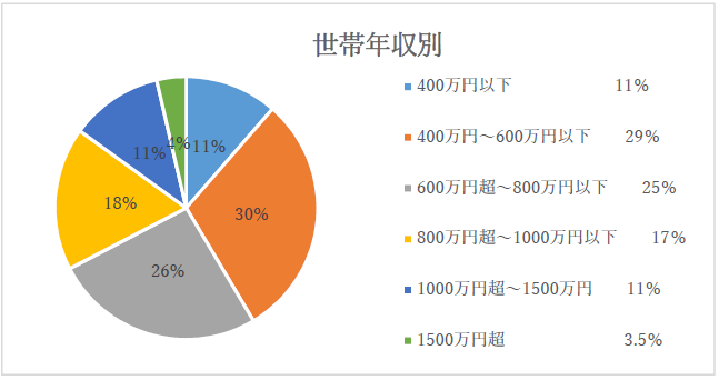 〈 図 〉 年齢別、家族構成、世帯収入の円グラフ