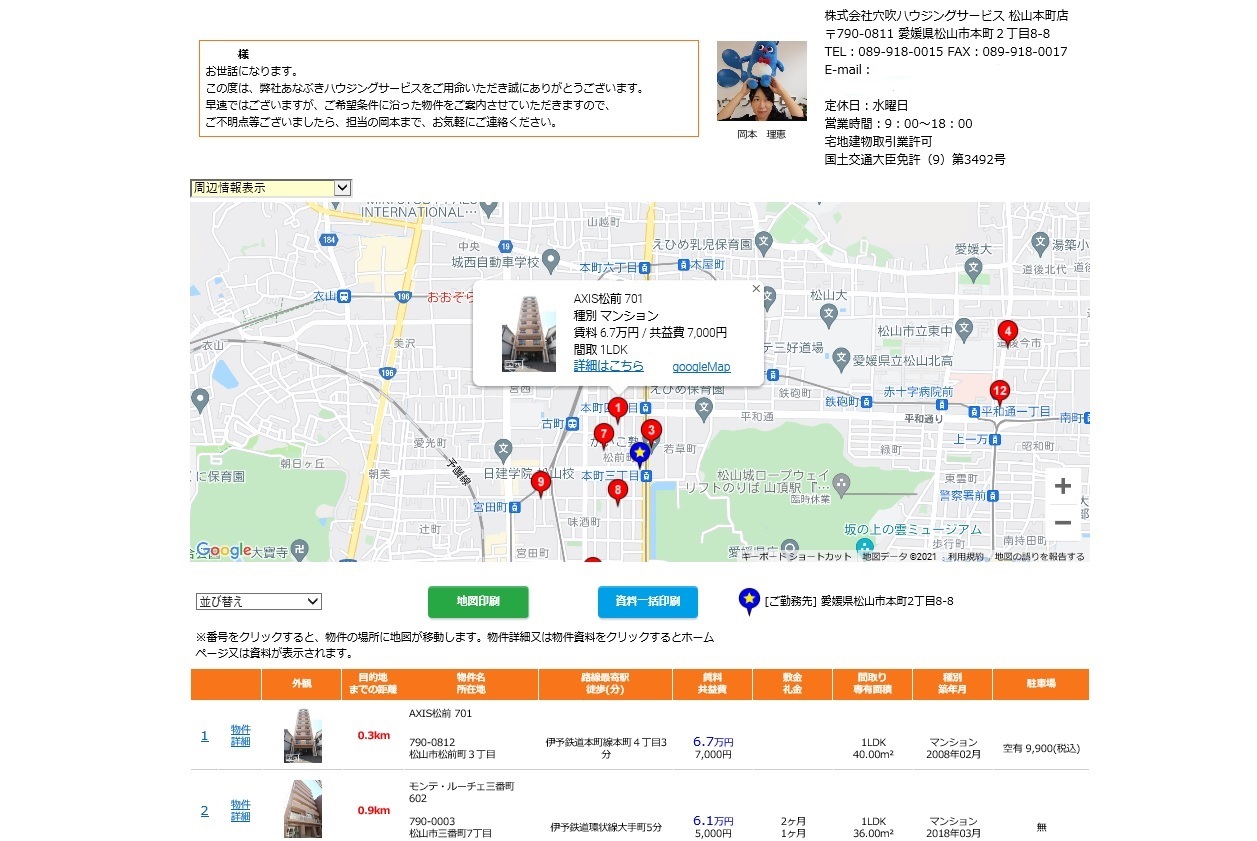 弊社の場合は、メールでURLをお送りし、地図上でどこにある物件か確認いただけるシステムを採用しています。