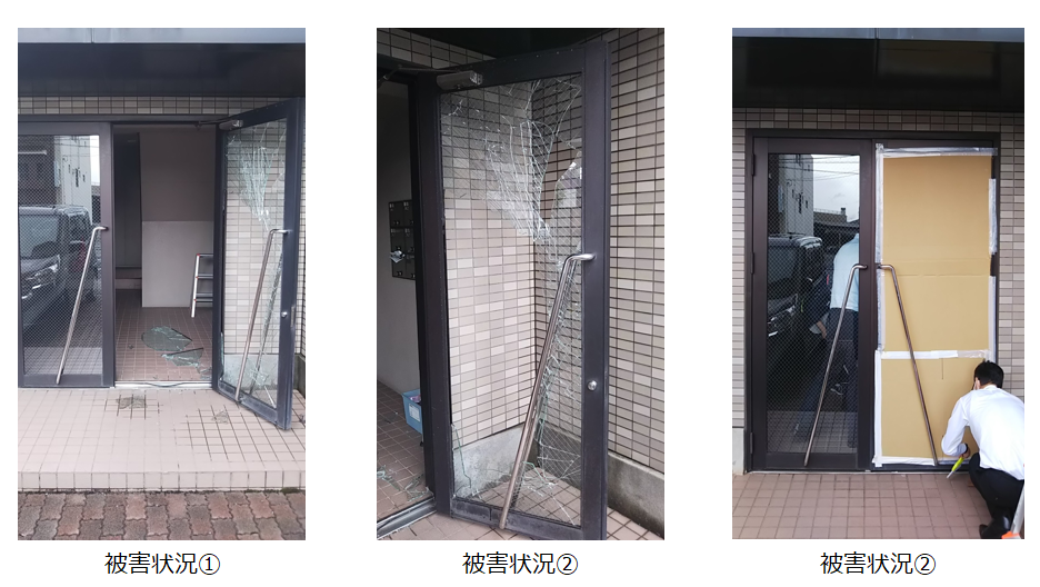 管理物件のエントランスドアガラスが強風により割れるといった大きな被害が発生しました。