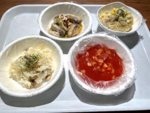 今回は省力化レシピとしてじゃがりこポテトサラダ、パッククッキングでチーズリゾット、トマトジュースを活用したスープ、鯖缶のアヒージョ風煮込みを作りました。