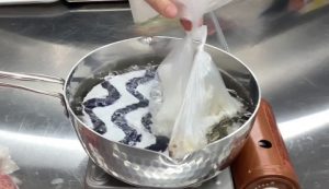 ㌽ 鍋底にポリ袋が触れないようにお皿を敷く