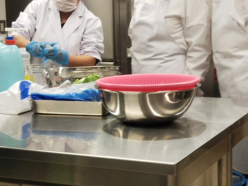 調理器具類の扱い方のほかにも、野菜の消毒や中心温度の測定の仕方など、弊社の衛生基準に基づいた基本動作についても体験していただきます。