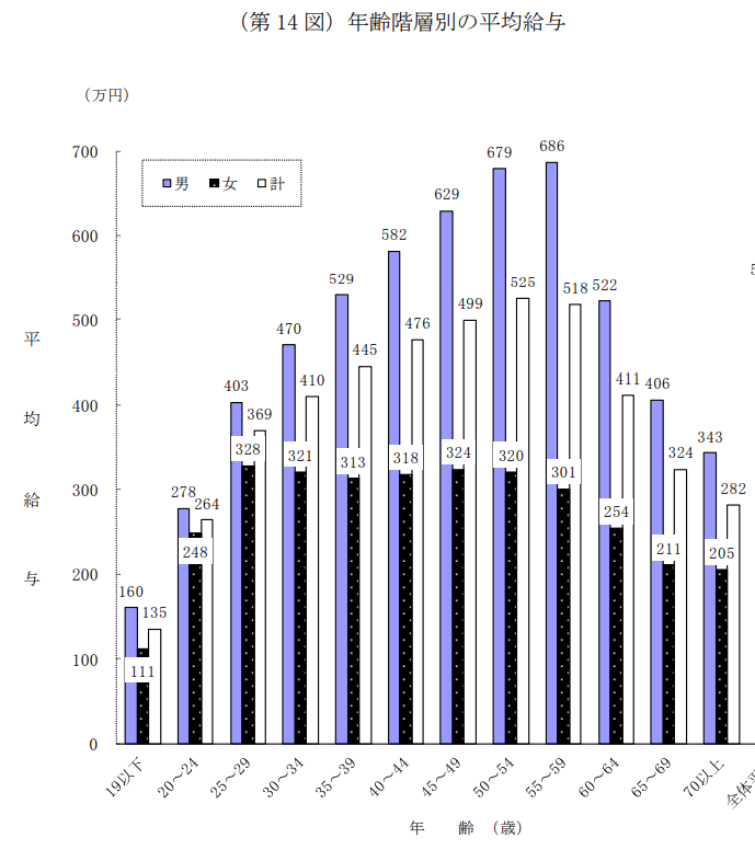 ご覧の通り、55-59歳は収入が最も高く、60歳以降、下がっていくことがわかります。