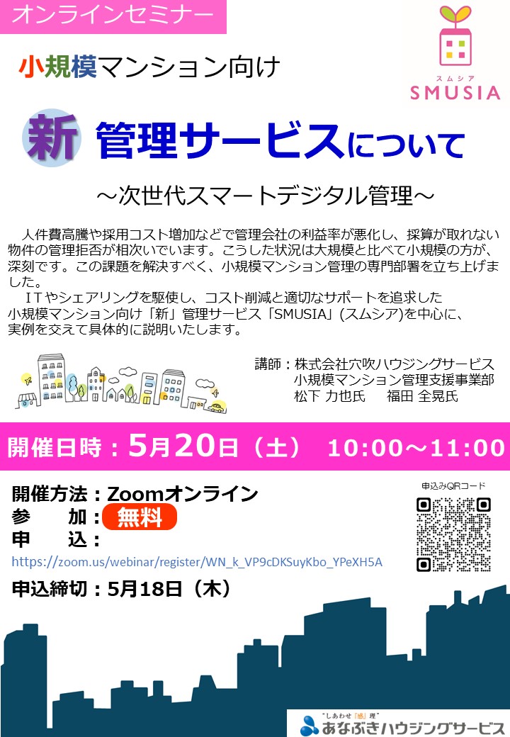 人件費高騰や採用コスト増加などで管理会社の利益率が悪化し、採算が取れない物件の管理拒否が相次いでいます。こうした状況は大規模と比べて小規模の方が深刻です。この課題を解決すべく、小規模マンション管理の専門部署を立ち上げました。ITやシェアリングを駆使し、コスト削減と適切なサポートを追求した小規模マンション向け管理サービス「SMUSIA」(スムシア)を中心に、実例を交えて具体的に説明いたします。