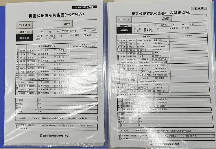 また、大規模災害発生時(就業時間ではない場合)、管理員、フロント担当だけではなく、社内事務社員でも状況確認・報告、現場の一次対応をできるようにしております。