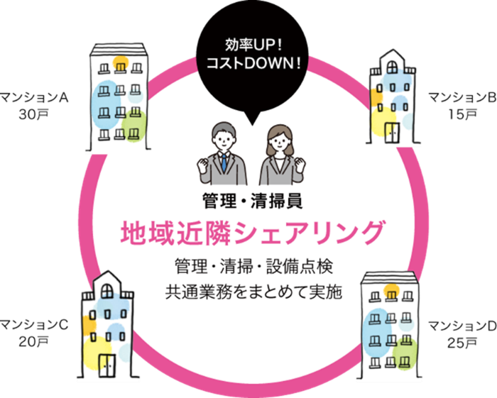 また、今まで予算やコストの関係で諦めたサービスを、近隣の小規模マンション同士の連携・シェアリングすることで、実現できます。