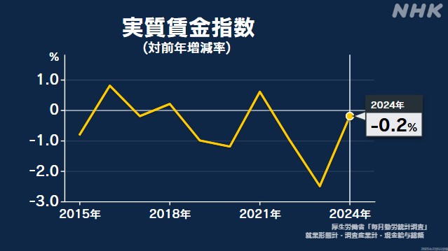 昨年1年間の働く人1人当たりの現金給与の総額は33年ぶりの高い伸びを記録しましたが、物価の上昇には追いつかず、実質賃金は前年と比べて0.2%減少し、3年連続のマイナスとなりました。
