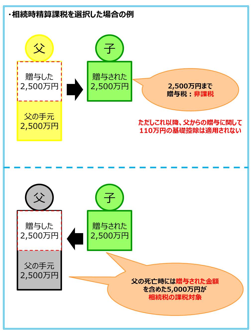 つまり相続時精算課税では、特別控除額2,500万円までの贈与にかかる贈与税は非課税になりますが、贈与者が相続税の対象となる場合は相続税として課税されるため、注意して利用する必要があります。