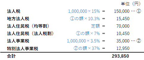 上記で紹介した税率をもとに法人税等の金額を簡易的に計算してみると…