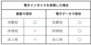 ※電子インボイスを書面として出力して保存する事も可能ですが、所得税や法人税では電子データは電子のまま保存しなければなりません。(電子帳簿保存法)