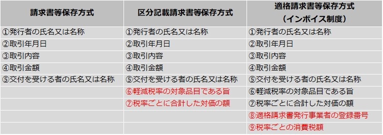 各請求書保存方式の記載項目の違いを下図にまとめました。