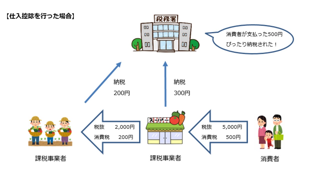 上の図でわかる通り事業者も商品を仕入れる時には消費税を支払っています、それにも関わらず受け取った消費税をそのまま納付した場合、仕入時に支払った消費税分が二重課税となってしまうのです。