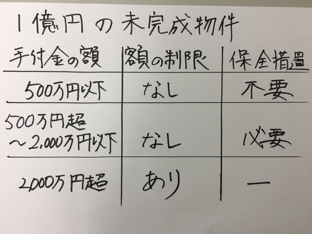では、具体例で説明しましょう。たとえば、1億円の未完成物件の場合、手付金等の金額が2,500万円の場合、1億円の10分の2である2,000万円を超えていますので、手付額の制限を受けます。手付金等の金額が1,000万円の場合、手付額の制限は受けませんが、1億円の5%である500万円を超えていますので、保全措置は必要です。手付金等の金額が500万円の場合、手付額の制限も受けませんし、1億円の5%である500万円を超えていませんので、保全措置も不要です。