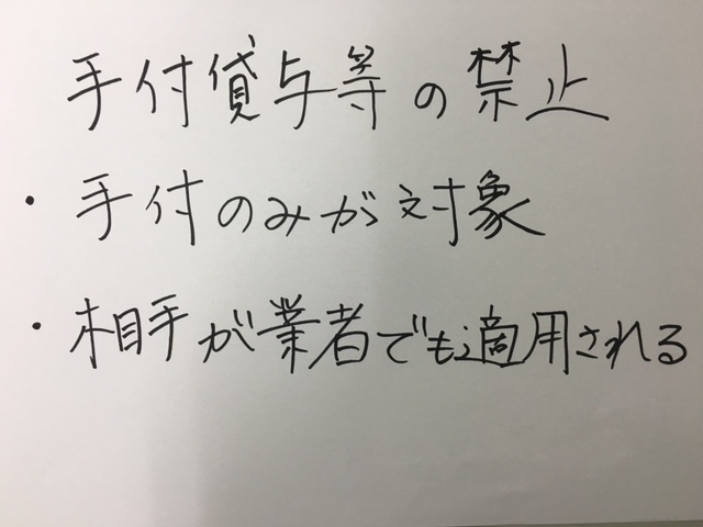 宅建業者は、その業務に関して、宅建業者の相手方等に対し、手付について貸付けその他信用の供与をすることにより契約の締結を誘引する行為をしてはなりません。たとえば、後払いや、分割払い、手付を手形で払う場合等が挙げられます。誘引する行為自体が禁止されており、その後に契約を締結したかどうかは関係ありません。