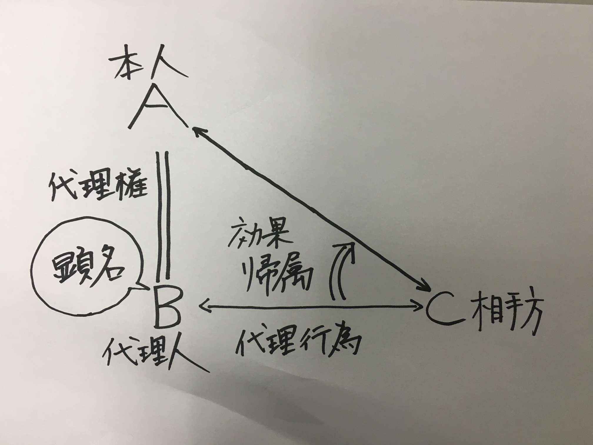 さらに、代理人Bが何も言わないで黙っているだけでは、相手方Cは、目の前にいるBと契約したと思ってしまうでしょう。誰と契約するかはとても重要なことです。「Bなら大丈夫」と思って契約したら、後で全然違うAが「私が本人です」と言って登場してきたら、Cはガッカリしてしまうでしょう。ですから、Bは代理行為に際して「私はAの代理人のBです」というふうに、本人のためにすることを表示しなければなりません。このような表示を「顕名(けんめい)」といいます(懸命にやれということではありません!)。
