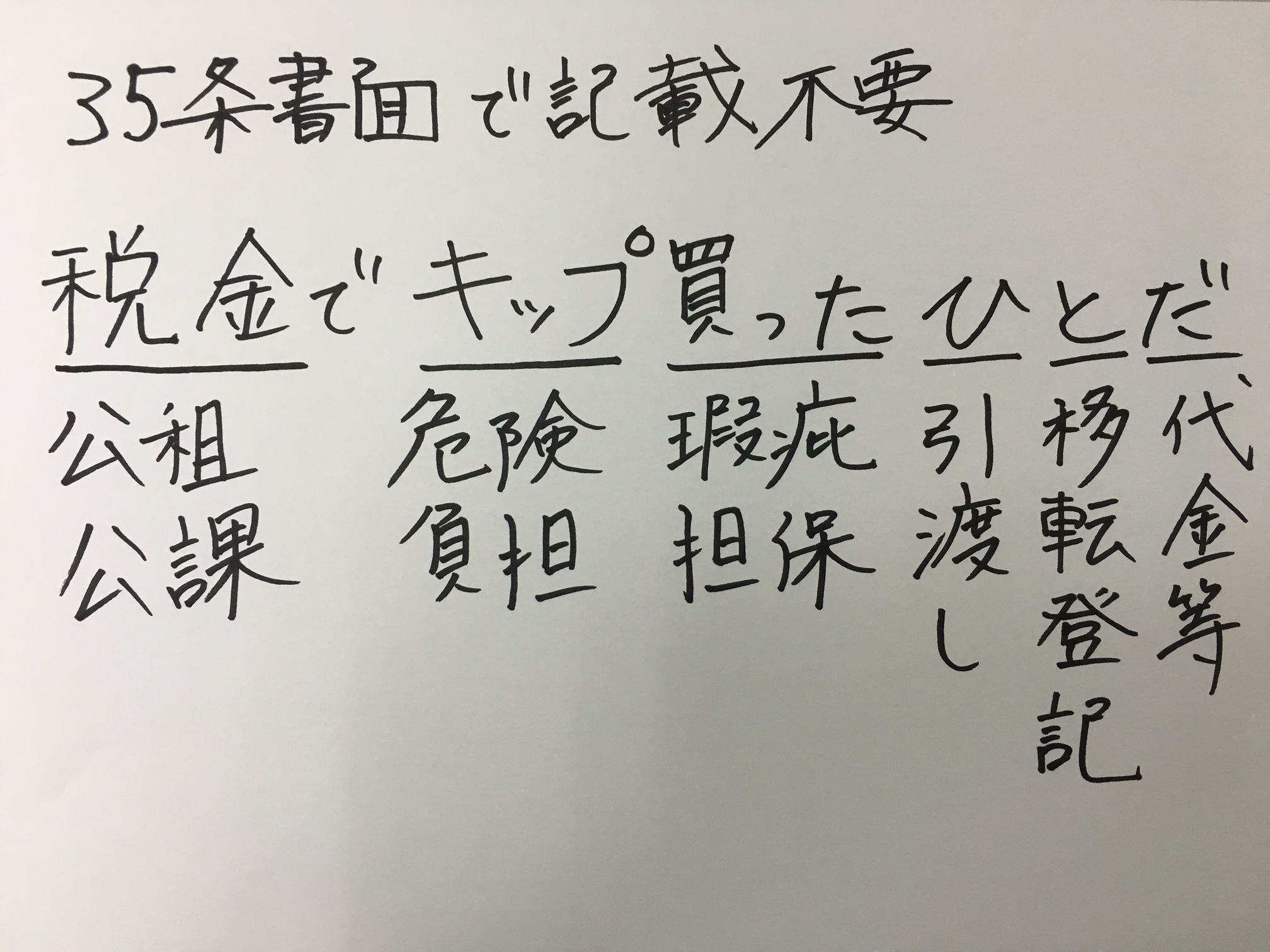 また、天災その他不可抗力による損害の負担に関する定めの内容、租税その他公課負担に関する定めの内容(貸借除く)、瑕疵担保責任についての定めの内容(貸借除く)も、37条書面に記載しますが、重要事項説明書面には記載しません。