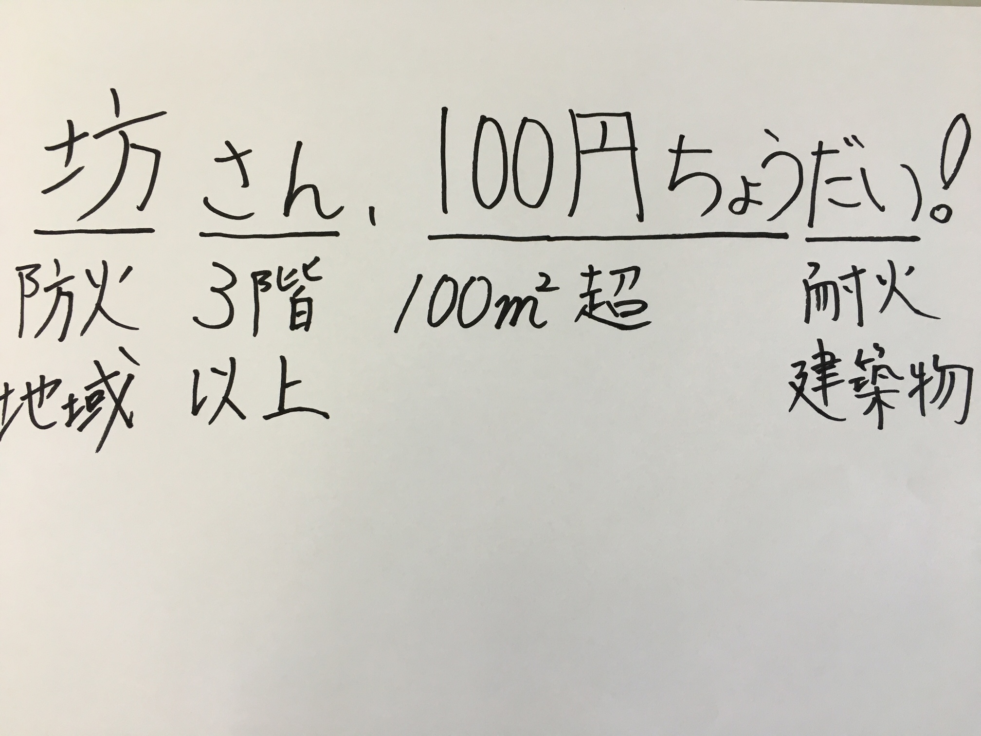 ところで、今回の防火・準防火地域の分野では、100㎡を超える、あるいは、1,500㎡を超える、というふうに、㎡に「超える」が付いていましたが、国土利用計画法の届出対象面積では、2,000㎡以上、5,000㎡以上…、都市計画法の開発許可の分野では、10,000㎡以上、というふうに、㎡に「以上」が付きますので、この機会にあわせて注意しておきましょう。