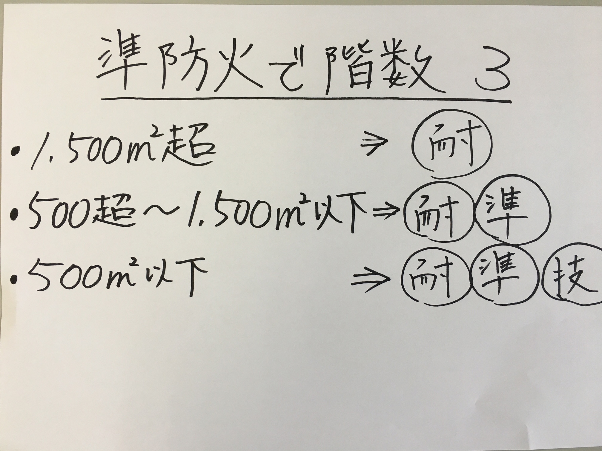 なお、準防火地域で、地階を除く階数が「3」の建築物は、延べ面積が500㎡以下であれば、耐火建築物、準耐火建築物、または、一定の技術的基準適合建築物にしなければならず、延べ面積が500㎡を超え1,500㎡以下であれば、耐火建築物または準耐火建築物にしなければならず、延べ面積が1,500㎡超であれば、耐火建築物にしなければなりません。このように、準防火地域で、地階を除く階数が「3」の建築物の制限は覚えやすいので、この機会にしっかりマスターしておきましょう。