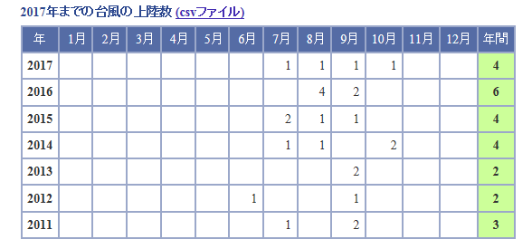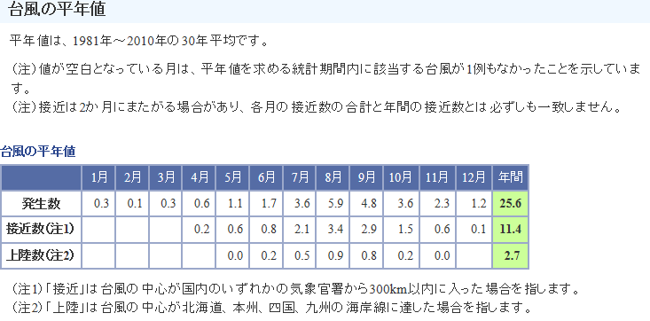 気象庁のホームページで過去の台風の平年値や上陸件数を確認する事ができます。