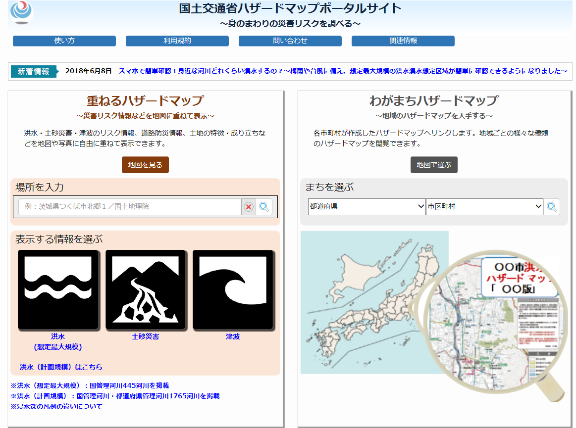 ハザードマップ(国土交通省)を調べておきましょう。