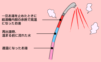 そのため、熱いお湯の次には燃焼されなかった冷たい(ぬるい)水が出るようになるのです。