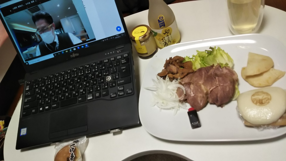 実際の「Ana Bar」の風景です。ここに写っているお酒やおつまみは、長崎県でスーパーを展開しているあなぶきグループのジョイフルサン(http://joyfulsun.co.jp/)から予め自宅へ送られてきたものです。どれもとても美味しく、話をしながらもどんどんと箸が進み、デザートのプリンまで美味しくいただきました。