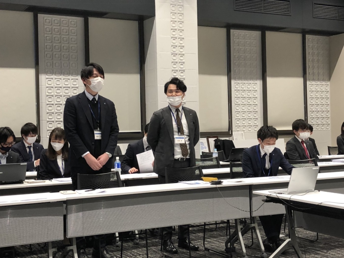 会場にはたくさんの役員、支店長の方々が新入社員を囲むように座っており、とても緊張感のある中、模擬総会は行われました。でも隣にはお助け役の先輩社員がついてくれていたので、とても安心できました。