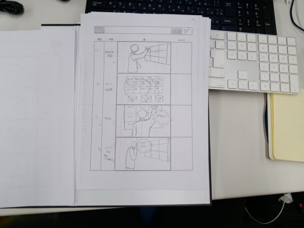 まず動画の撮影が決まると、どのような流れで、だれを出演させ、何処で撮影するのかという流れを絵コンテなども用いながら細かく決める作業に入ります。出演者も基本的に社員で行っておりますので、出演者のキャスティングやセリフもここで決めてしまいます。制作担当者はどのような動画にすればお客様や社員に伝わりやすいのかしっかりと考え、写真のように絵コンテを用いながらシナリオを作っていきます。