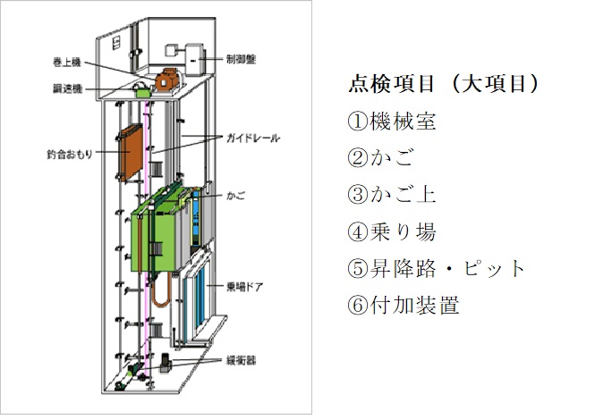 この定期的な保守点検は昇降機の使用頻度等に応じて専門業者に行ってもらうもので、1回/月行うことが推奨されています(法定ではない)